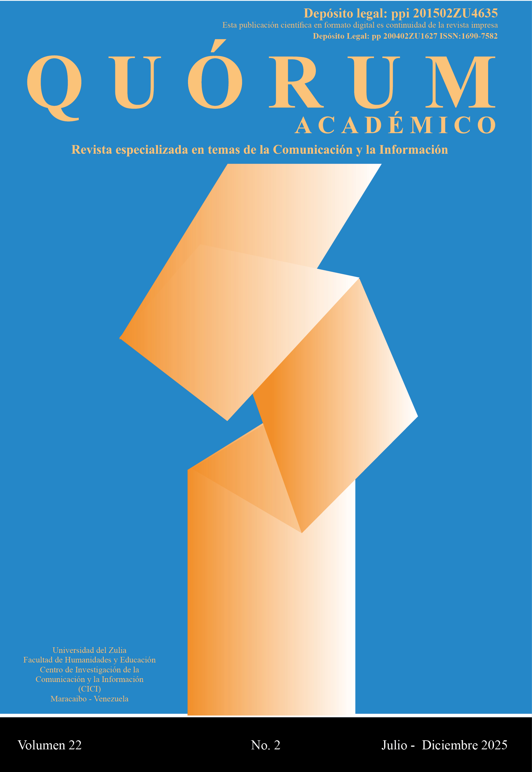 Vol. 18 Núm. 2 (2021)La revista Quórum Académico está adscrita al Centro de Investigación de la Comunicación y la Información (CICI), de la Facultad de Humanidades y Educación de la Universidad del Zulia. Quórum Académico representa una respuesta a un ideal compartido por nuestra comunidad de investigadores de crear un foro de discusión teórica y epistemológica sobre los profundos cambios en los ejes temáticos del ámbito de la comunicación y especialmente en la problemática de su ense – ñanza en las universidades. Es decisivo por lo tanto gestar cambios en los enfoques, métodos y te – mas que deben abordarse en la investigación de la comunicación, no sólo por constituir un fenó – meno planetario cuyas extensas redes y vínculos provocan profundas divisiones y exclusiones so – ciales y culturales, sino porque la comunicación también guarda un inmenso campo inexplorado desde donde también se puede inventar la emancipación. Quórum Académico es una revista arbitrada, especializada en temas de la comunicación y la información, se publican dos números al año, hasta consolidar el proyecto y optar por una mayor periodicidad. Las ediciones pueden ofrecer trabajos sobre los fenómenos de la comunicación y la información, demostrando su estrecha relación con el contexto socio-cultural y político que los define. Para algunas ediciones se organizarán convocatorias sobre temas monográficos.