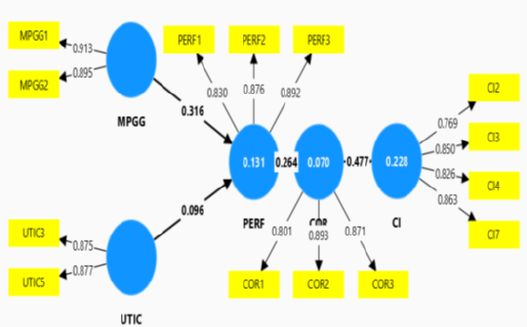 En el Análisis Factorial Confirmatorio (AFC), los índices obtenidos respaldan la validez y el ajuste aceptable del modelo propuesto: SRMR = 0.102, d-ULS = 1.095, d-G = 0.749, X² = 176.767 y NFI = 0.932. Estos resultados, conforme a los criterios de Ringle et al. (2024) y Rojas-Torres (2020), confirman la adecuación del modelo. Los detalles se presentan en la Tabla 3.