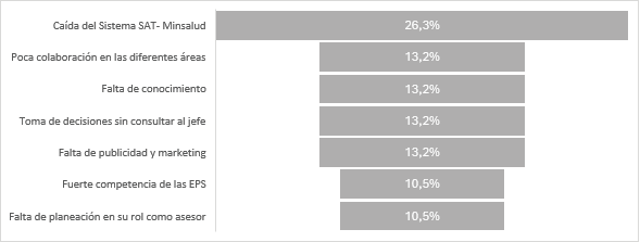 La percepción de los asesores comerciales pone en evidencia problemas operativos y organizacionales que afectan la eficiencia de los procesos de afiliación y atención de las EPS. La caída recurrente del sistema SAT–Minsalud es la principal limitación tecnológica, mientras que la falta de coordinación entre áreas, el desconocimiento de funciones y la escasa promoción de los servicios destacan debilidades en los procesos operativos y comunicación institucional. Estos problemas internos hacen que las EPS respondan más lento y les cueste destacarse frente a otras. Por eso, es clave mejorar la infraestructura digital, capacitar constantemente al personal y trabajar en cómo se posicionan frente al usuario.