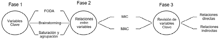 Se empleó la versión 6.1.2 (2003-2004) del software Micmac®. Este software es de distribución gratuita y de código abierto, y ha sido desarrollado por el Instituto Francés de Innovación Informática para la Empresa (3IE, Institut d’Innovation Informatique pour l’Entreprise), bajo la supervisión del Laboratorio de Investigación Estratégica y Organizacional LIPSOR. Su aplicación comprende tres (3) fases (Diagrama 1):