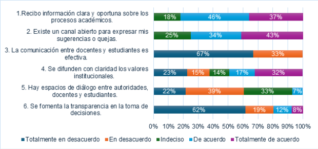No obstante, también se destacan aspectos críticos como un 62% que se opone completamente a que se promueva la transparencia en la toma de decisiones, y un 39% discrepa de la presencia de espacios de conversación entre autoridades, profesores y estudiantes. Esta información pone en guardia acerca de una cultura institucional en la que predomina la comunicación operativa, pero se encuentra ausente el diálogo participativo, lo que podría restringir la formación de confianza, la responsabilidad compartida y el sentimiento de pertenencia entre los participantes en la educación (Añez, 2020).