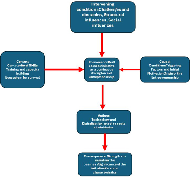 Regarding open coding , the data obtained from the interviews was examined line by line, extracting 278 codes. These codes were then refined, eliminating duplicate concepts associated with different categories, resulting in 30 codes.Following the paradigm of Strauss and Corbin (1998) for the axial coding strategy, considering the phenomenon of entrepreneurs women role in the digitization of their MSMEs, the causal conditions include the motivations for entrepreneurship, while the intervening conditions include challenges and obstacles, structural influences, and social influences. The context, considering the complexity of MSMEs, actions and strategies, are the responses to the phenomenon and the intervening conditions, and consequences are the negative or positive results of the entrepreneurial process. In this phase, they were grouped into 30 codes and 7 subcategories (table 1).