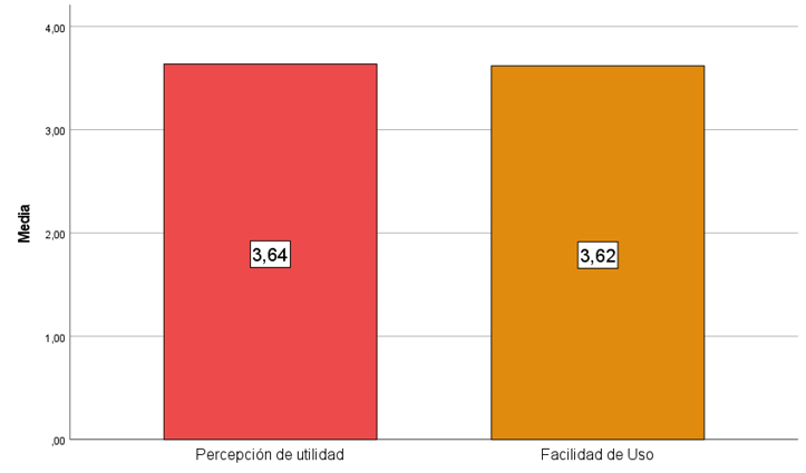 En el gráfico 1 se presentan resultados del modelo de aceptación tecnológica (TAM), el que se obtiene a través del cálculo del valor promedio de las preguntas de cada categoría de forma que se convierte en número continuo entre 1 y 5; lo cual muestra que tiene percepción de utilidad 3.64 y facilidad de uso 3.62, valores cercanos entre sí, mismos que establecen un nivel por encima de la mitad de aceptación del uso de nuevas tecnologías en el uso de actividades académicas por parte de los estudiantes universitarios.