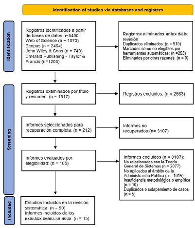 Se aplica la metodología PRISMA, estructurada en cuatro fases (identificación, cribado, elegibilidad e inclusión), partiendo de un total de 5.480 artículos, los cuales fueron depurados mediante criterios de inclusión y exclusión. En la fase de elegibilidad se revisaron los textos completos con el apoyo de software especializado en análisis cualitativo y visualización bibliométrica (MAXQDA 24 y VOSviewer), descartándose los documentos no recuperables o que no cumplían con los criterios metodológicos establecidos. Se incluyeron 105 estudios que satisfacen los criterios temáticos y metodológicos definidos (diagrama 2).