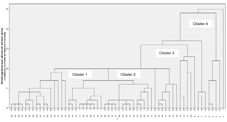 El algoritmo Louvain no genera den-dogramas por sí mismo; estos se construyen como complemento visual a partir de matrices de similitud o distancia derivadas de la red, práctica metodológicamente aceptada en estudios bibliométricos. La altura de las ramas indica distintos niveles de disimilitud entre grupos, confirmando una estructura temática coherente y consistente con el índice de modularidad obtenido (Ilustración 7).