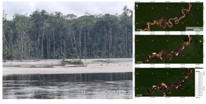 Os mapas da Figura 13 evidenciam atividades de mineração artesanal e de pequena escala (ASGM) na bacia do rio Boia, município de Jutaí (Figura 14), inclusive antes do intervalo analisado. Os alertas de desmatamento entre o quarto trimestre de 2020 e o primeiro de 2024 corresponderam fielmente às alterações detectadas. Entre o segundo trimestre de 2022 e o primeiro de 2024, intensificaram-se mudanças morfológicas típicas da ASGM, como cortes artificiais de meandros (neck e chute cutoff), assoreamento, alargamento do canal, erosão de margens, formação de barras, praias e ilhas, além do avanço das frentes de garimpo sobre a planície aluvial. A imagem de março de 2024, em período de cheia, mostra o encobrimento das praias formadas a partir dos sedimentos depositados nas vazantes.