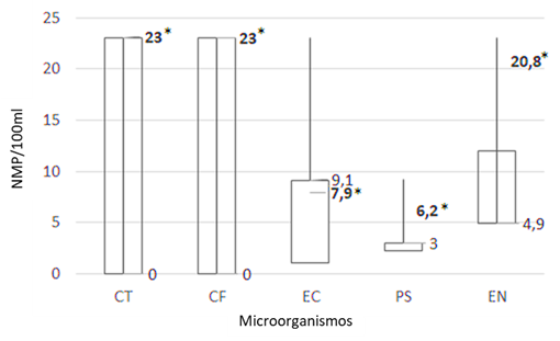 enterococci and Pseudomonas were quantified. Also, pH, salinity, turbidity,