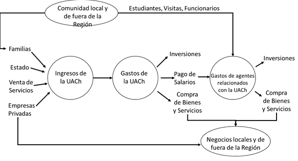 Los efectos directos en la economía corresponden a las compras de bienes, pago de servicios e inversiones y a los ingresos por las visitas que se realizan a la Región, por las familias de los estudiantes o para asistir a eventos científicos y culturales organizados por la Universidad.