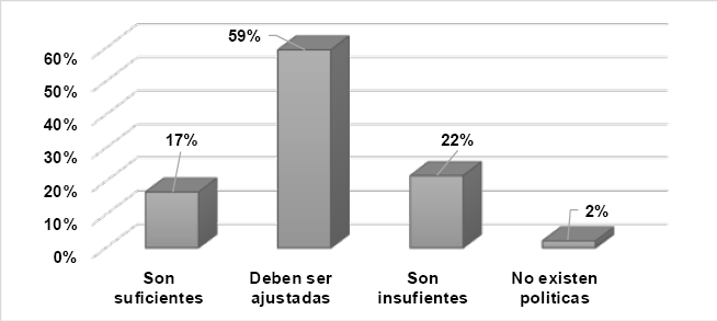 Sobre la necesidad de contar con políticas contables para el manejo y control de inventarios se identifica que en las microempresas del sector farmacéutico del departamento del Tolima el 59% consideran que sus políticas de inventarios deben ser ajustadas y un 22% expresan que no son suficientes, como señala Barraza-Macías (2019), el no contar con políticas para el manejo de los inventarios que permitan definir, controlar y guiar los niveles adecuados de existencias y su administración no habrá claridad en el procedimiento de planificación y mejorar el suministro de estos.