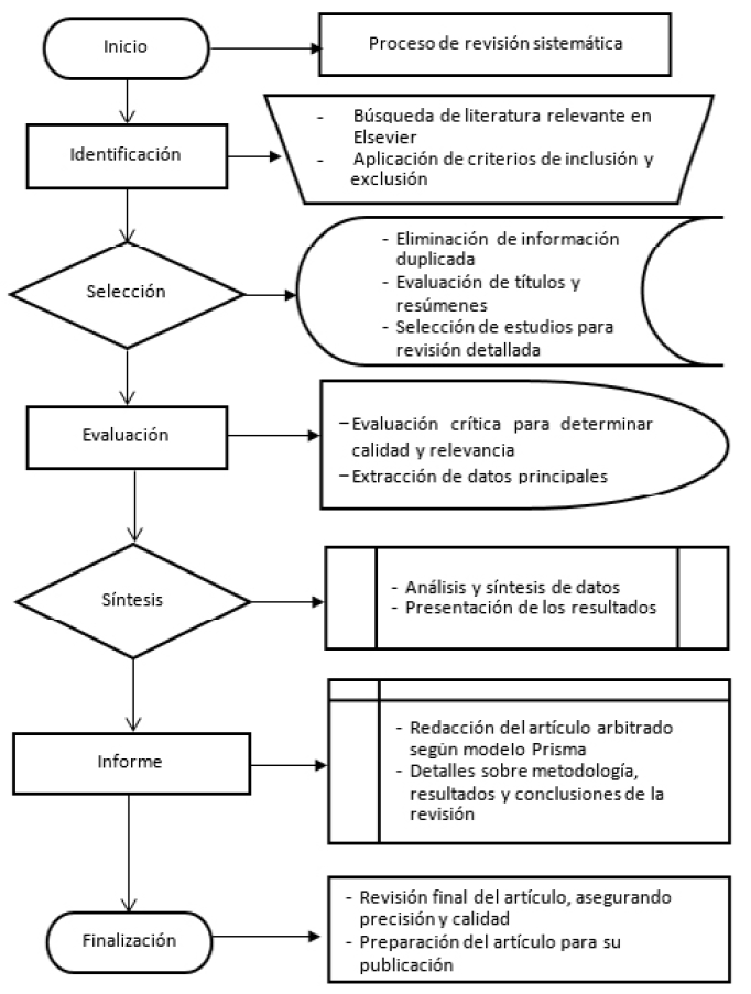 El diagrama 1 presenta el flujograma PRISMA, que describe un proceso riguroso de revisión. En la fase de identificación, se realiza una búsqueda exhaustiva en Elsevier; en la selección, se aplican criterios para eliminar duplicados y evaluar títulos y resúmenes; y en la evaluación, se revisa la calidad de los estudios. Finalmente, en la síntesis, se redacta el artículo asegurando precisión y coherencia antes de su publicación.