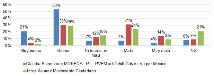 Para el año 2024, Claudia Sheinbaum fue la candidata que mejor imagen tuvo de cara a los votantes, con un 74% de opinión pública positiva. Xóchitl Gálvez obtuvo un 45% de imagen negativa (Gráfico 5)