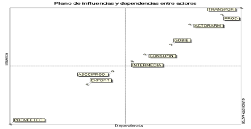 En el plano de influencias y dependencias de la ilustración 3, los transportadores (TRANSPOR) y productores (PROD) aparecen como los actores más influyentes, mientras que proveedores tecnológicos y exportadores muestran mayor dependencia. Esto sugiere la necesidad de fortalecer capacidades tecnológicas y de gestión en los actores más subordinados.