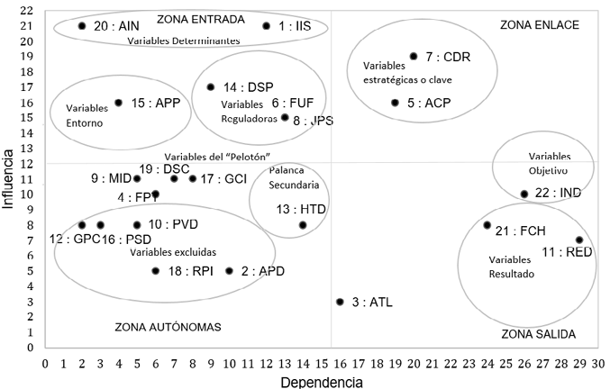 Finalmente, las variables clasificadas como del pelotón 9MID (Motivación e interés en el deporte), 19DSC (Desarrollo de sectores conexos), 17GCI (Gestión del conocimiento e información), 4FPT (Fuerza y tendencia positiva) y 3ATL (Aprovechamiento del tiempo libre) no tienen suficiente influencia y dependencia para identificar claramente su papel en el sistema. Sin embargo, su comportamiento indirecto puede reflejar aspectos clave que deben considerarse al tomar medidas al respecto.