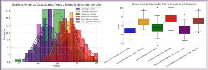En la ilustración 1, se muestra que las distribuciones se concentraron en rangos bajos y con mayor dispersión, especialmente en liderazgo y clima escolar. Sin embargo, tras la intervención, las curvas se desplazaron hacia la derecha, aumentando las medianas y reduciendo la variabilidad. Este hecho reflejó un progreso homogéneo entre los estudiantes. En tal sentido, las mejoras resultaron de la aplicación de metodologías activas, entre ellas, sociodramas, mediación cultural y aprendizaje reflexivo en forma transversal.