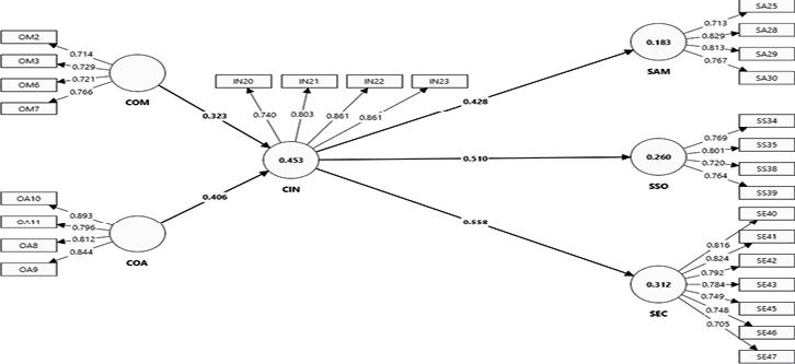Se corroboró el efecto de la validez predictiva (Cohen, 1998) del modelo con el tamaño del efecto f2: 0.020, 0.150, 0.350 (pequeños, medianos, grandes), se percibieron efectos grandes en las relaciones: CIN -> SEC (f2 = 0.453) y CIN -> SSO (f2 = 0.351), efectos medianos en CIN -> SAM (f2 = 0.224) y COA -> CIN (f2 = 0.154), y efecto pequeño en la relación COM -> CIN (f2 = 0.097).