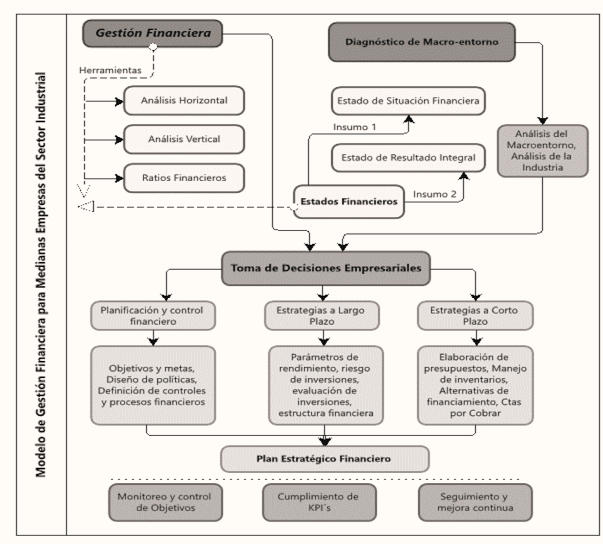 El modelo propuesto indica que la gestión financiera tiene insumos necesarios para poder aplicar las herramientas de gestión, como lo son el análisis horizontal, vertical y las ratios financieras. Esta información, datos, cálculos, sumada a la información del macroentorno por medio del análisis del sector y de la industria, permitirá la toma de decisiones. Para la toma de decisiones es necesario el desarrollo de un Plan Estratégico Financiero, el cual debe contener tres elementos: